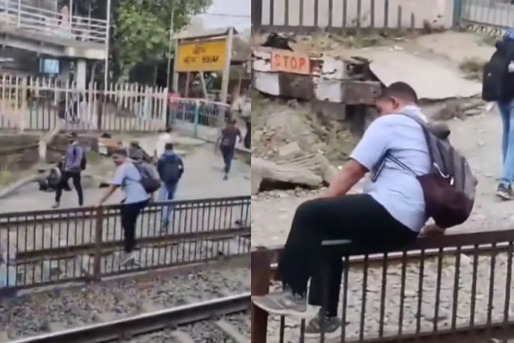 Viral Video में रेलिंग पर चढ़कर रेलवे ट्रैक क्रॉस करता दिखा शख्स