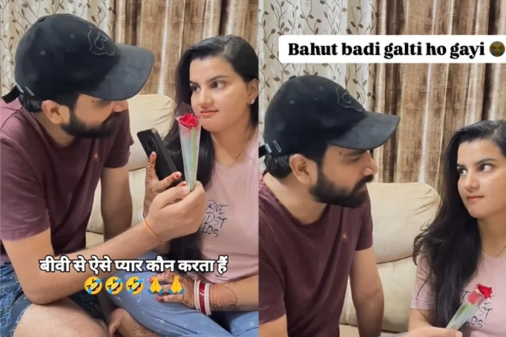 वीडियो में एक पति अपनी बीवी के पास आता है और रोमांटिक होते हुए गुलाब का फूल देने लग जाता है. महिला पहले तो पति के इस अंदाज से चौंकती है. उसके बाद वो गुस्से से आग-बबूला हो जाती है. आदमी को समझ नहीं आता है कि, आखिर उसकी बीवी ऐसा क्यों कर रही है? इसके बाद महिला गुस्से में कहती है कि, तुम किस लड़की का नाम ले रहे हो मेरा नाम तो नेहा है. दरअसल, जब पति अपनी बीवी को फूल दे रहा होता है तो वह किसी दूसरी लड़की का नाम बीवी के सामने ले रहा होता है.
