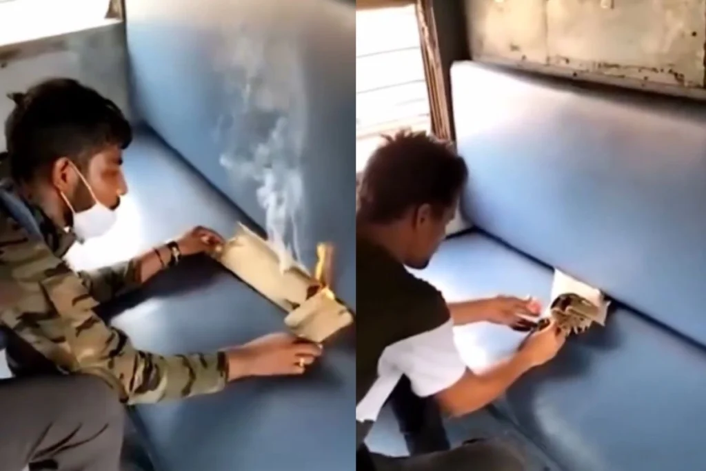 ट्रेन की सीटों को जलाते लड़के कैमरे में कैद?