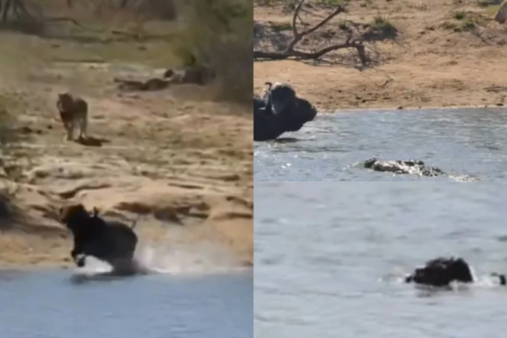 एक तरफ शेर दूसरी तरफ मगरमच्छ बीच में फंसा भैंसा