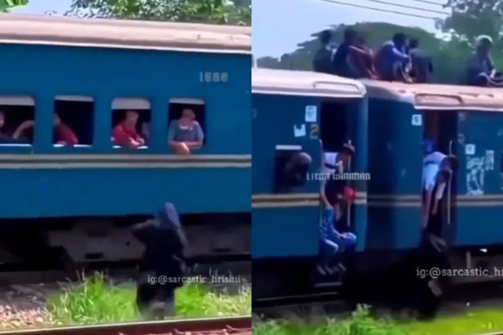 इस Viral Video में एक एक लड़का और लड़की हकीकत में चलती हुई ट्रेन पर स्टंट करते हुए दिखे हैं। ये घटना बांग्लादेश की बताई जा रही है। इस वीडियो को एक्स पर अपलोड किया गया है। इसमें देखा जा सकता है कि, बुर्का पहने हुए एक लड़की ट्रेन की तरफ दौड़ती हुई जा रही है। इस दौरान ट्रेन अपनी स्पीड से चल रही है। ये लड़की अपनी जान की परवाह किए बिना लड़के तक पहुंच जाती है। लड़का भी चलती हुई ट्रेन में उसे खींचने की कोशिश करता है। लेकिन तभी अचानक से उसका हाथ छूट जाता है और लड़की बहुत जोर से जमीन पर गिरती है । बुर्का पहनी हुई लड़की हादसे का शिकार होते-होते बचती है। ये वीडियो काफी डरावना है।
