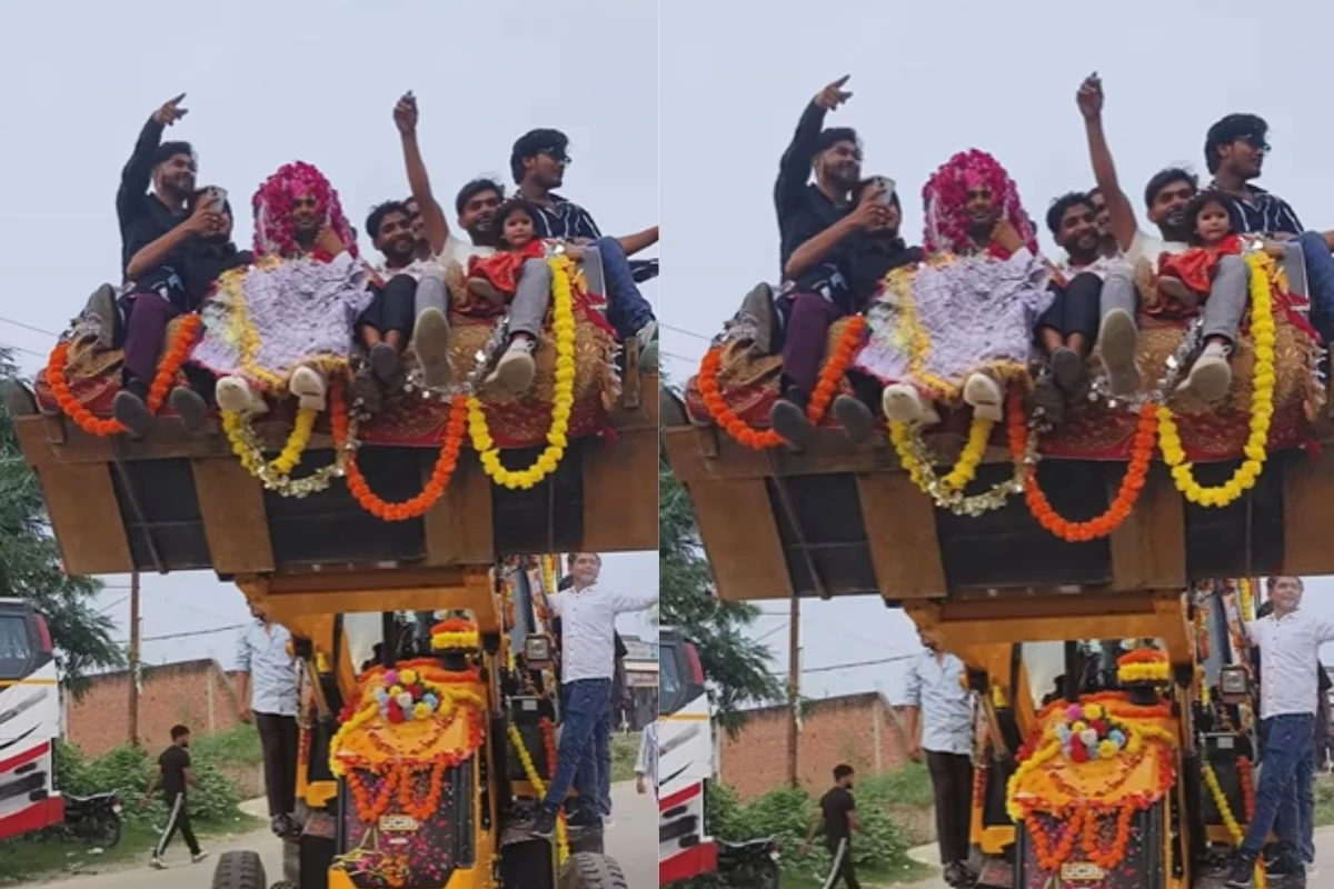 बुलडोजर पर बारात लेकर पहुंचा दूल्हा