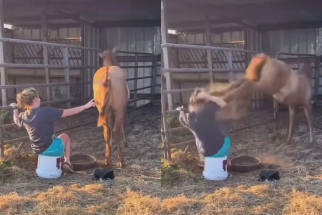 लेकिन इसे qu नाम के इंस्टाग्राम अकाउंट से अपलोड किया गया है। वीडियो में देखा जा सकता है कि, एक लड़की घोड़े के पास बैठी हुई है। वह उसे पहले खाना खिलाती है। इसके बाद उसे प्यार से सहलाना शुरु कर देती है। एक-दो बार तो घोड़ा पीछे हटने की कोशिश करता है। लेकिन बाद में वह युवती के मुंह पर घुमाकर लात मार देता है। जिसके बाद वह हवा में उड़ते हुए दूर जाकर गिरती है। जिस रफ्तार से वो उसे मारता है, दिखने में काफी डरावना और खतरनाक लग रहा है। घोड़े के इस रिएक्शन को देखकर साफ लग रहा है कि, उसे लड़की का छूना अच्छा नहीं लगा है।