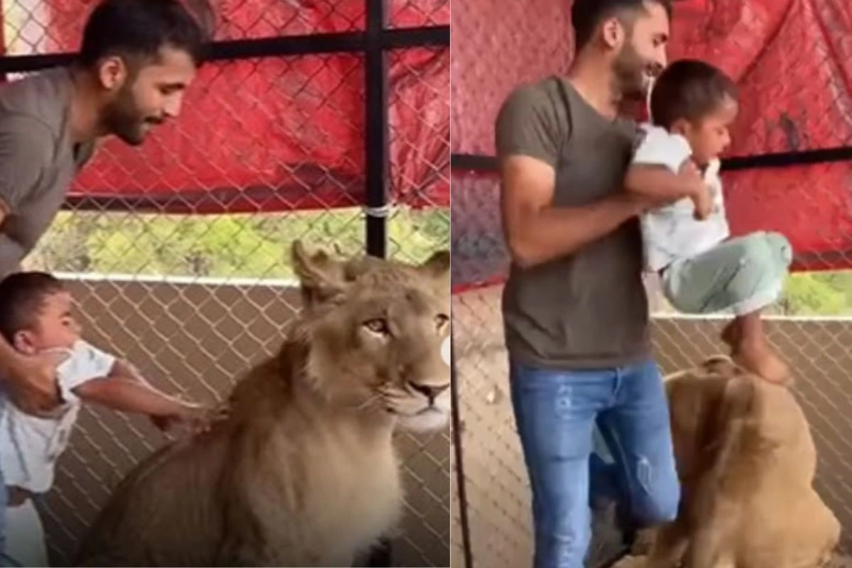 शेर की कमर पर बाप ने बच्चे को बैठाया
