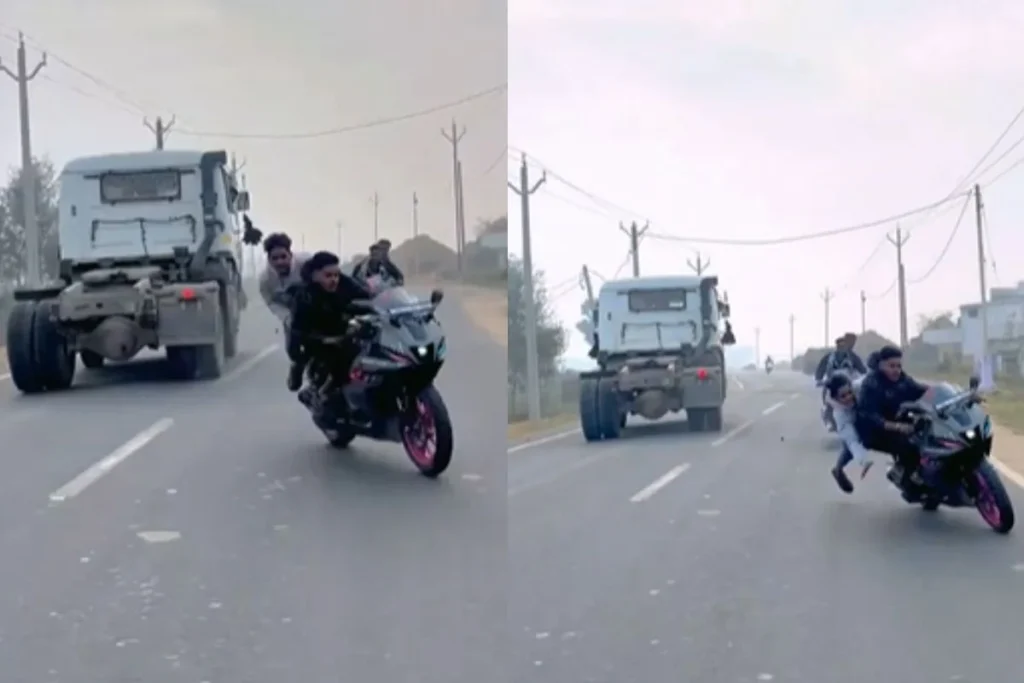 Viral Video में टशन मारते दिखा बाइक सवार हवा में करता दिखा बात