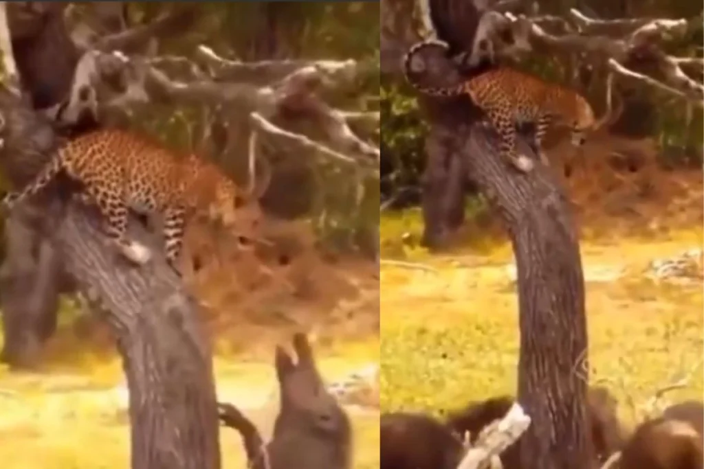 वीडियो में देखा जा सकता है कि, सुअरों के झुंड से खौफ में आया तेंदुआ पेड़ के ऊपर बैठा हुआ है। इनमें से एक सुअर हमला करने के लिए भी छलांग लगा रहा है। लेकिन तभी अचानक से तेंदुआ सुअरों के झुंड के बीच छलांग लगा देता है और पलक झपकते ही अपने शिकार को पकड़कर पेड़ के ऊपर भी ले आता है। इसके बाद जमीन पर मौजूद सभी सुअर दंग रह जाते हैं। उन्हें समझ नहीं आता है कि, वो क्या करें? लेपर्ड ने ये साबित कर दिया है कि, वो ही असली शिकारी है।