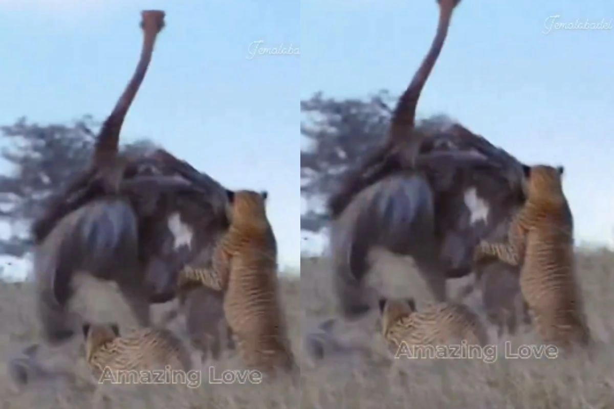 चीतों ने शुतुर्गमुर्ग को पकड़ा हुआ है. वह इसे काबू करना चाहते हैं लेकिन इसका साइज काफी बड़ा है. जिसकी वजह से वह इनके काबू में नहीं आ रहा है .इसीलिए वह इसकी टांगों पर हमला कर देते हैं. शुतुरमुर्ग की मोटी- मोटी टांगों पर वह ऐसे चिपक रहे हैं जैसे कि मुर्गे की टंगड़ी हो. वीडियो में काफी देर तक दोनों के बीच जिंदगी और मौत की जंग चलती रहती है .लेकिन अंत में यह चीते शुतुरमुर्ग का शिकार करने में कामयाब हो जाते हैं और उसे जमीन पर गिरा देते हैं.