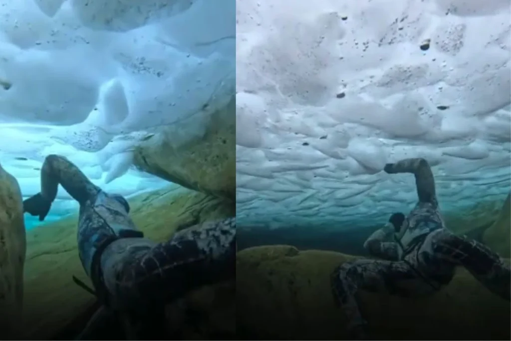 सोशल मीडिया पर एक गोताखोर का वीडियो वायरल हो रहा है। इसमें वह बर्फ से जमी झील या फिर समुद्र में फंसा नजर आ रहा है। इस दौरान वह खुद को बचाने की कोशिश कर रहा है। लेकिन स्थिति के आगे बेबस है।