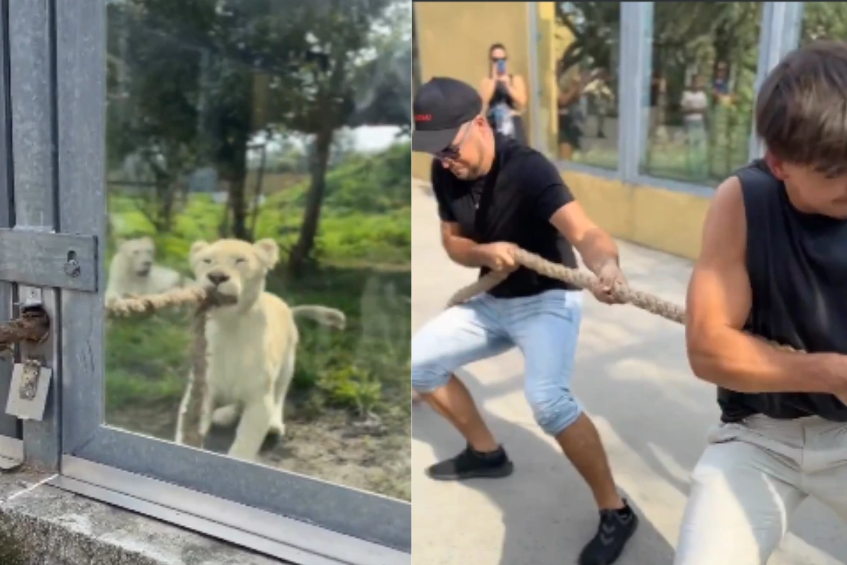 रस्सा खींच गेम में इंसानों पर भारी पड़ा शेर