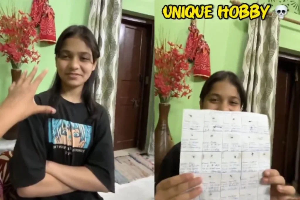 वायरल वीडियो की शुरुआत होती है एक लड़की से जो मुस्कुराती हुई नजर आ रही है तो वहीं पीछे से एक और लड़की कहती हुई दिख रही है कि “लोगो के इतने अजीब शौक होते हैं ना इसकी शौक दिखाती हूं तुमको। इसके अलग ही शौक है।” फिर एक पेपर की झलक दिखाई देती है जिसमें अलग-अलग मच्छर को मार कर चिपकाया गया है और उस पर नाम लिखा गया है। इसके साथ ही लड़की ने हर मच्छर के नाम के नीचे यह भी लिखा है कि आखिर उसने कब और कहां इस मच्छर को मारा।