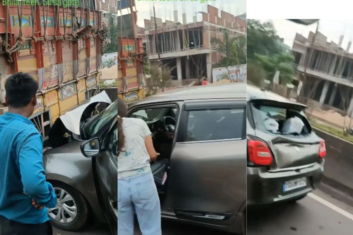 ट्रकों के बीच फंसी Maruti Swift Car का हुआ बुरा हाल