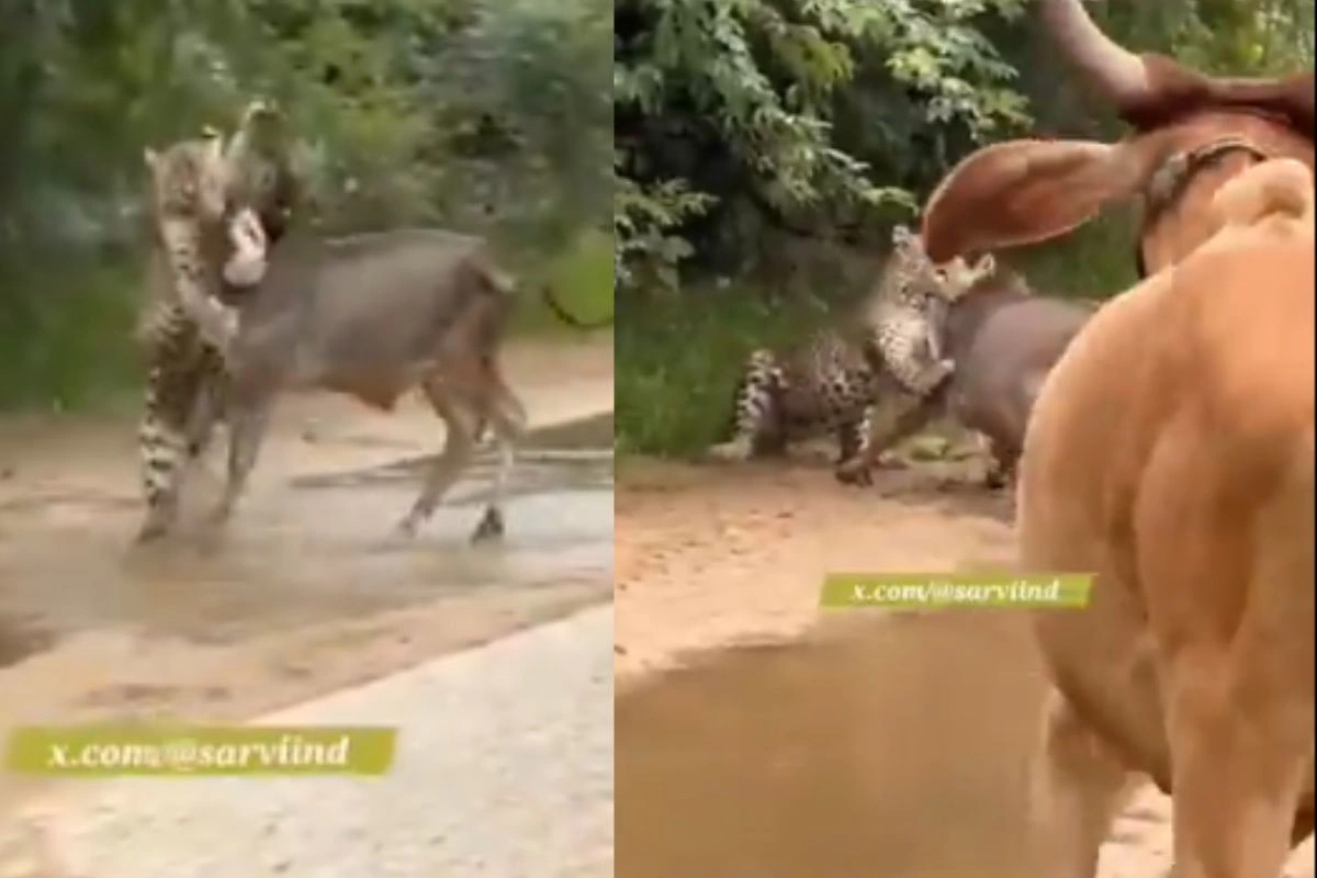 इस दौरान गाय का बच्चा खुद को बचाने की कोशिश कर रहा लेकिन, वो शिकारी की मजबूत पकड़ के सामने बेबस हो चुका है। लेकिन तभी अचानक से वहां पर गाय आ जाती है और वो लेपर्ड से भिड़ जाती है। गाय की हिम्मत और जज्बे को देखकर तेंदुए को वहां से भागना पड़ जाता है। जब ये घटना घटी वहां पर मौजूद किसी व्यक्ति ने इसे रिकॉर्ड कर लिया जो कि, अब आग की तरह फैल रहा है।