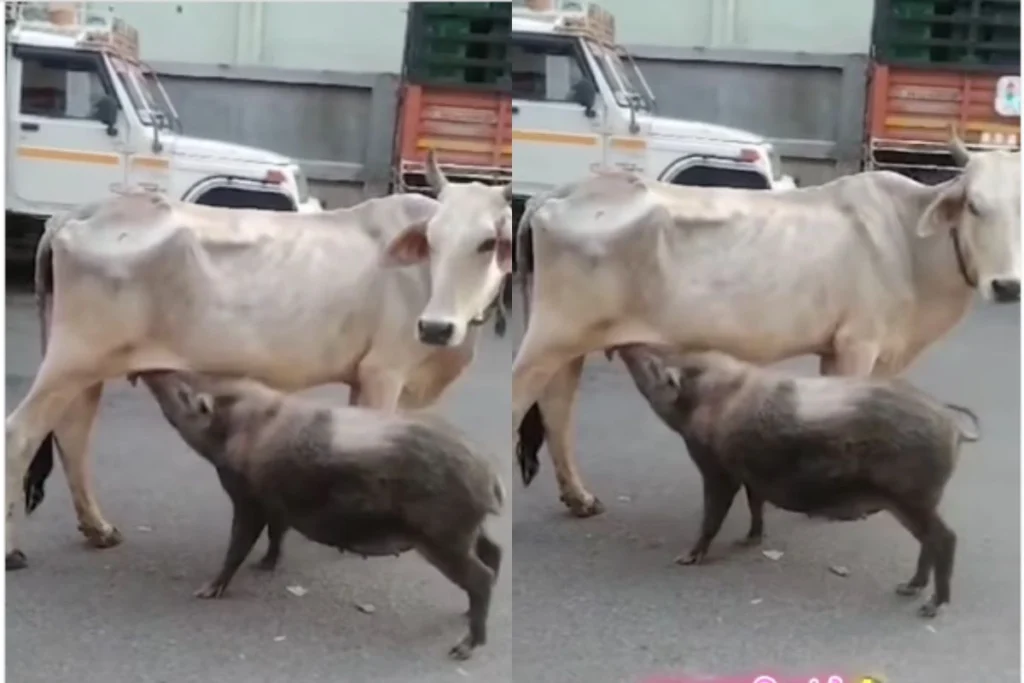 इस वीडियो में देखा जा सकता है कि, बीच सड़क पर गौ माता खड़ी हैं और एक बड़ा सा सूअर खुश होते हुए दूध पी रहा है। गाय को सूअर अपनी मां समझ रहा है और आराम से बिना किसी डर के पेट भर रहा है। इस दौरान गाय भी एक मां की तरह व्यवहार करते हुए सूअर पर प्यार लुटा रही है। गाय की इस ममता को देख लोग भावुक हो गए हैं।