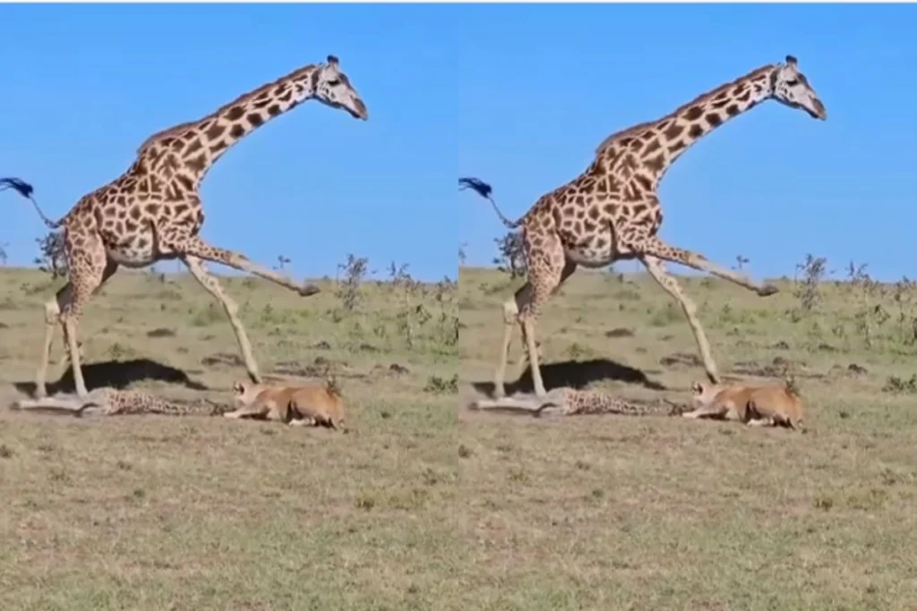 शेर पर टूट पड़ी जिराफ मां