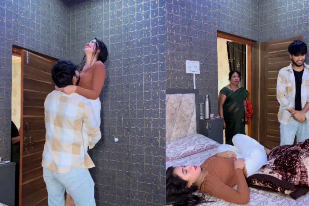 जब कपल एक दूसरे के साथ रोमांस कर रहा होता है, तभी अचानक से लड़के की मां की कमरे में एंट्री होती है. बीवी को गोद में उठाकर प्यार कर रहे पति की नजर जब अपनी मां पर पड़ती है तो वो बीवी को बिस्तर पर पटक देता है. इस दौरान बहू भी शर्म से लाल हो जाती है.