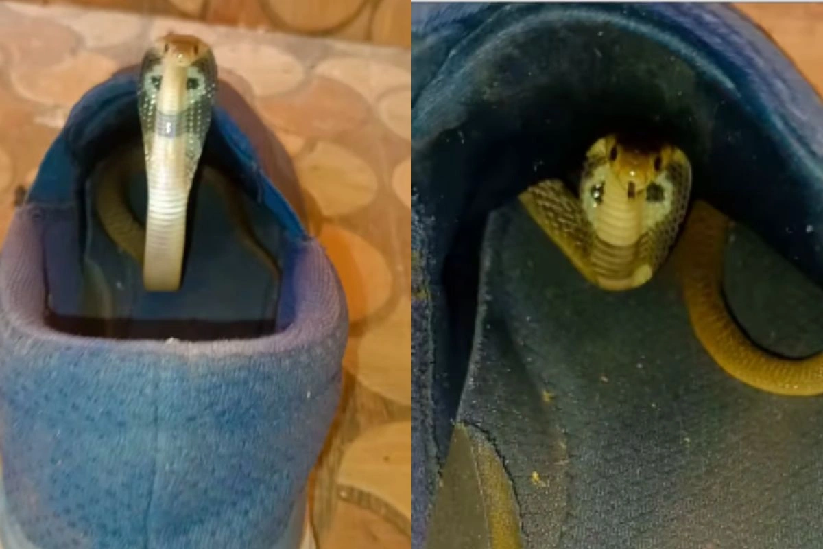 जूते में बैठे किंग कोबरा ने दिखाया गुस्सा
