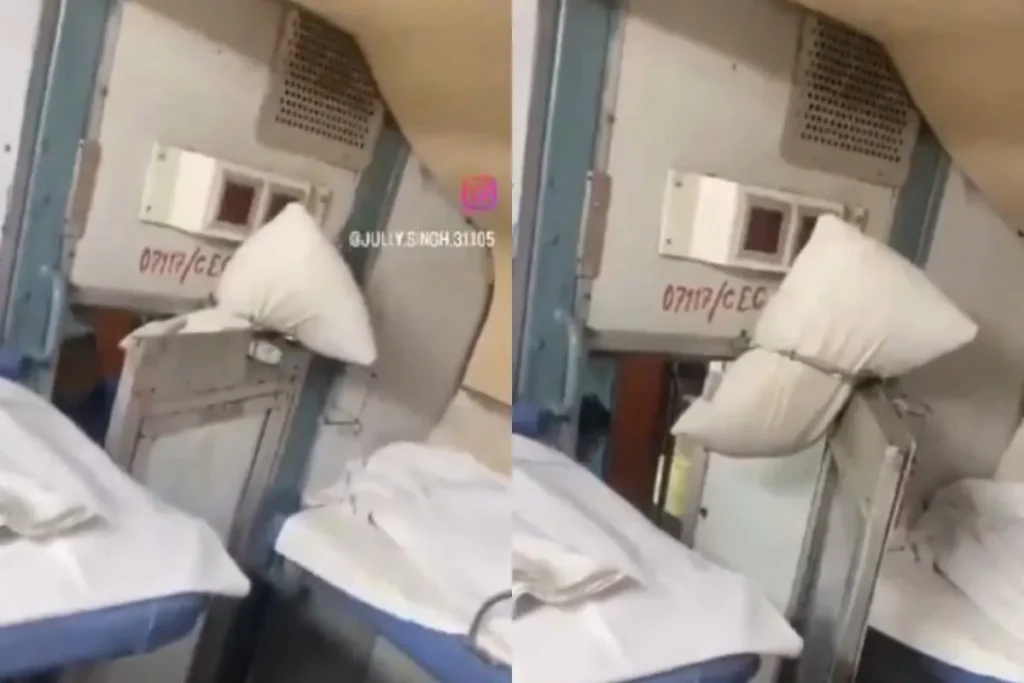 Viral Video: सोशल मीडिया पर एक वीडियो वायरल हो रहा है। इसमें ट्रेन के दरवाजे से परेशान होकर यात्रियों ने तकिया लगा दिया। इसके बाद ये वीडियो वायरल हो गया।