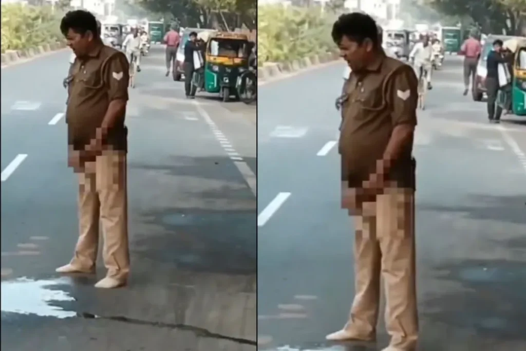 बीच रोड पर पेशाब करते हुए पुलिस वाला कैमरे में कैद