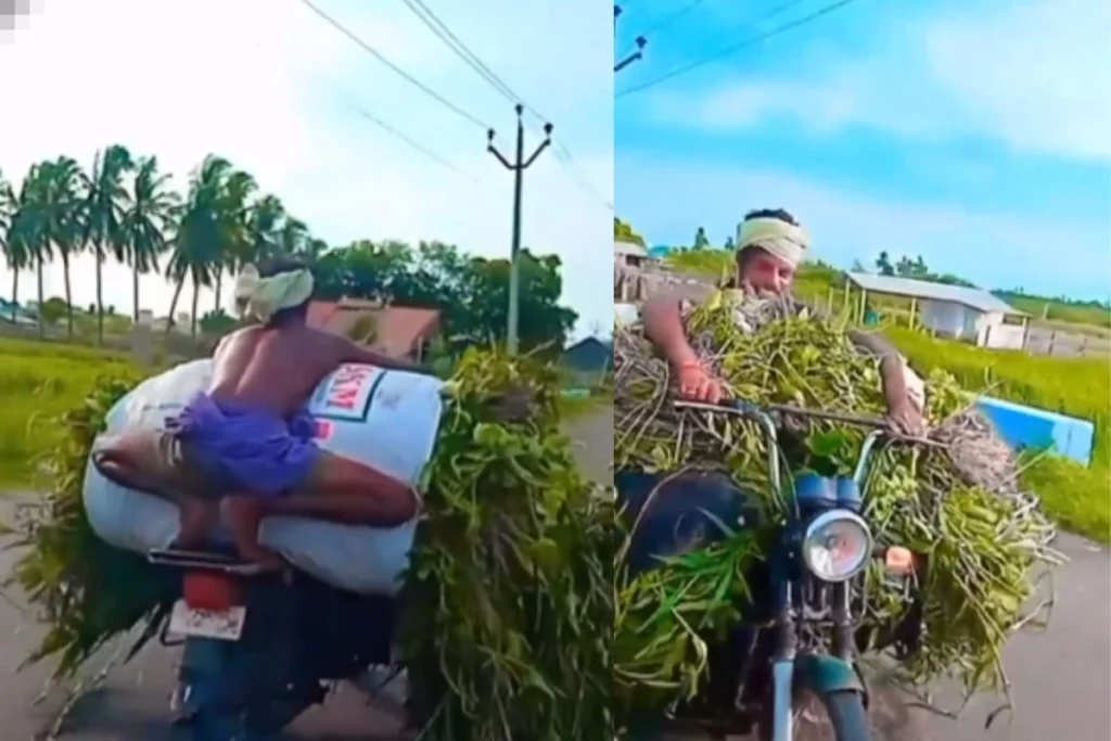 Viral Video: एक शख्स ने अपने जानवरों के लिए चारे ले जाते हुए दो पहिए वाली गाड़ी में की ओवरलोडिंग। सोशल मीडिया पर वायरल हुई वीडियो।