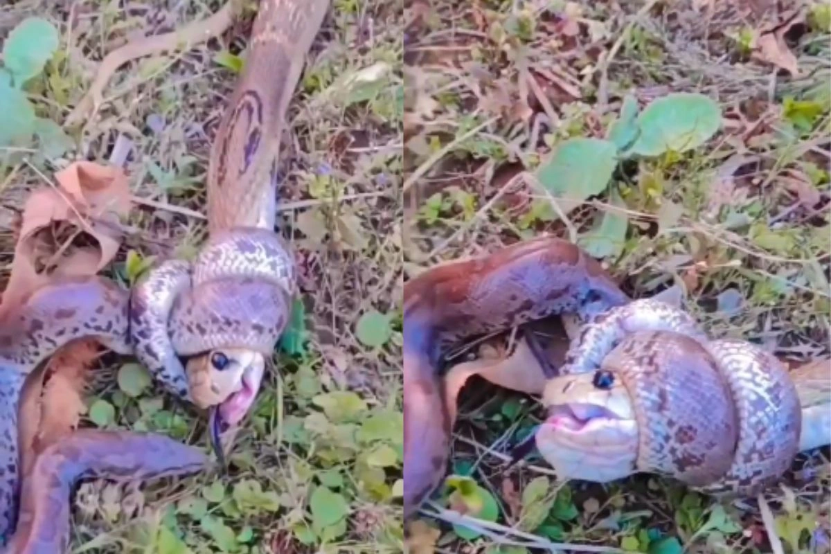Viral Video: सांपों में किंग कोबरा का अलग ही जलवा है। ये सबसे जहरीले स्नेक में गिना जाता है। वहीं, अजगर में जहर तो नहीं होता है लेकिन ये अपनी मजबूत पकड़ से शिकार को जिंदा ही निगल जाता है। लेकिन क्या आपने कभी इन दो शिकारियों को आपस में लड़ते हुए देखा है? अगर नहीं तो इस वीडियो में देख लीजिए। सोशल मीडिया पर किंग कोबरा को मारते हुए एक अजगर का वीडियो वायरल हो रहा है। अजगर ने जिस तरह से कोबरा के जहरीले मुंह को दबोए हुए है उसे देख यूजर्स दंग हैं। आज से पहले शायद ही ऐसा नजारा कभी कैमरे में देखने को मिला होगा।