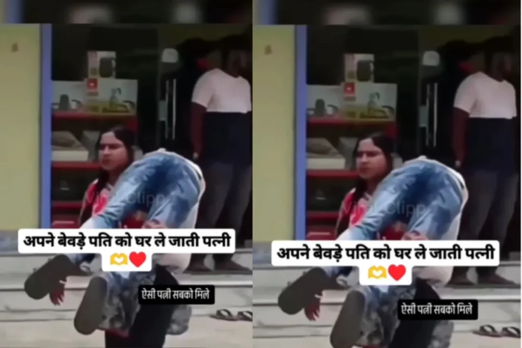 यह वीडियो इसलिए हैरतअंगेज हो जाता है क्योंकि, एक महिला अपने नशेड़ी पति को अपने कंधे पर डालकर बीच सड़क से गुजर रही है. महिला बड़ी हिम्मत और ताकत दिखाते हुए अपने इस बेवड़े पति को कंधे पर डालकर ले जा रही है.