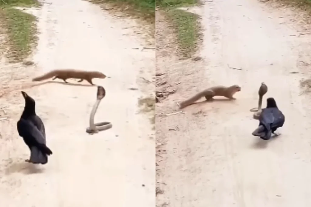 ये घटना किसी कच्ची सड़क की लग रही है। इसमें एक सांप बुरी तरह से कौवे और नेवले के बीच घिर गया है। ये दोनों ही शिकारी उसे मारकर खाना चाहते हैं। सांप को इस बात का एहसास हो चुका है लेकिन, वो वक्त और हालातों के सामने बेबस हो चुका है। वीडियो के अंत में नेवला मौका देखते ही सांप की गर्दन पकड़कर उसे वहां से ले जाता है और कौवा देखता रह जाता है। बेचारा सांप चाहकर भी खुद को नहीं बचा पाता है।