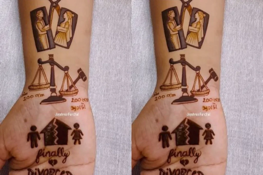 इस डाइवोर्स मेहंदी के वीडियो में देखा जा सकता है कि, किस तरह से डिजाइनर ने कोर्ट के फैसले से लेकर पहले मियां बीवी और फिर बच्चों को अलग होने का सिंबॉलिक रुप दिखाया है। इतना ही नहीं इसमें घर को टूटते हुए भी दिखाया गया है। तलाक वैसे तो हर इंसान की जिंदगी का बेहद खौफनाक पल होता है। लेकिन इस मेहंदी लगवाने वाली महिला को लगता है ज्यादा खुशी हो रही है। इसलिए वह इसका जश्न अनोखी मेहंदी लगाकर मना रही है। आज से पहले शादी ही किसी ने इसके बारे में सोचा होगा।