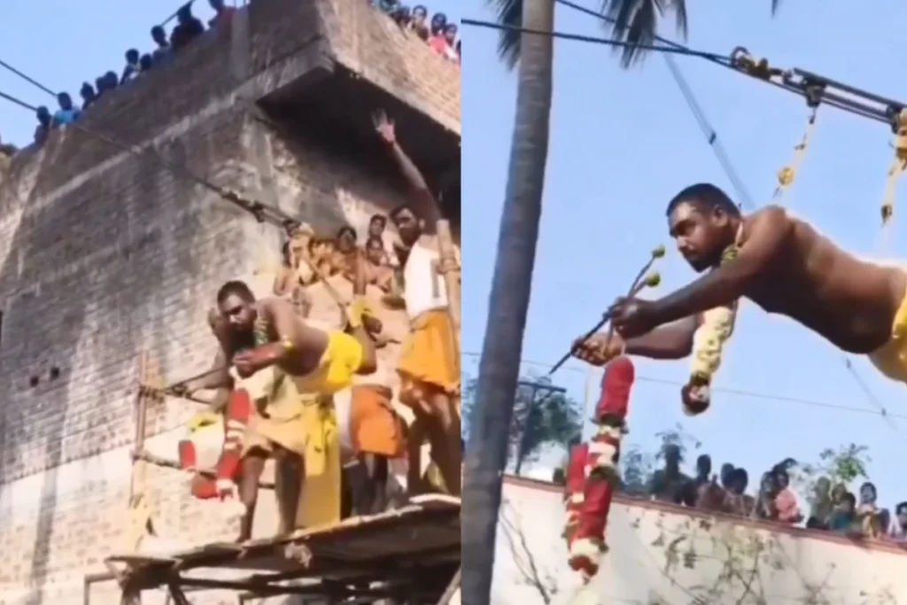 हमारे देश में आए दिन न जाने कितने ही छोटे बड़े धार्मिक आयोजन होते है। हमारे देश में आस्था में विश्वास रखने वाले लोगों की कोई कमी नहीं है और देखा जाता है कि धार्मिक आयोजनों में भीड़ भी काफी होती है। ऐसे ही एक आयोजन का वीडियो सोशल मीडिया पर वायरल हो रहा है जिसमें श्रद्धालुओं को एक रोमांचकारी स्टंट देखने का अवसर मिलने वाला था। Viral Video में देखा जा सकता है करीब एक मंजिल की ऊंचाई के मंच पर एक रोप वे बनाया गया था जिसका दूसरा सिरा काफी दूरी पर एक अन्य मंच से जुड़ा हुआ था। एक पुजारी जी को। हाथ में त्रिशूल और माला लेकर रोप वे के एक छोर से लटककर दूसरे छोर तक पहुंचना था।