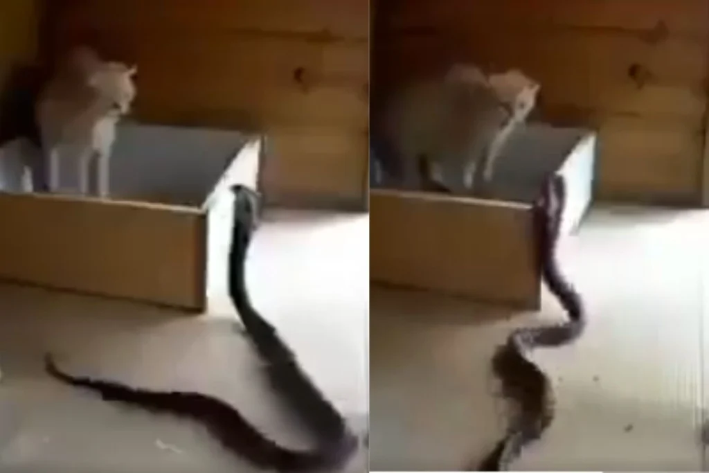 वीडियो में देखा जा सकता है कि, एक बिल्ली अपने बच्चों के साथ बॉक्स में बैठी हुई है। तभी वहां पर एक काला बड़ा सा नाग आ जाता है। वो सीधे बिल्ली की तरफ फन फैलाकर हमला करने की कोशिश कर रहा है। इस दौरान बिल्ली सांप के मुंह पर थप्पड़ बरसाना शुरु कर देती है। जिसके बाद सांप को वहां से भागना पड़ जाता है। ये वायरल वीडियो काफी तेजी से X पर फैल रहा है।