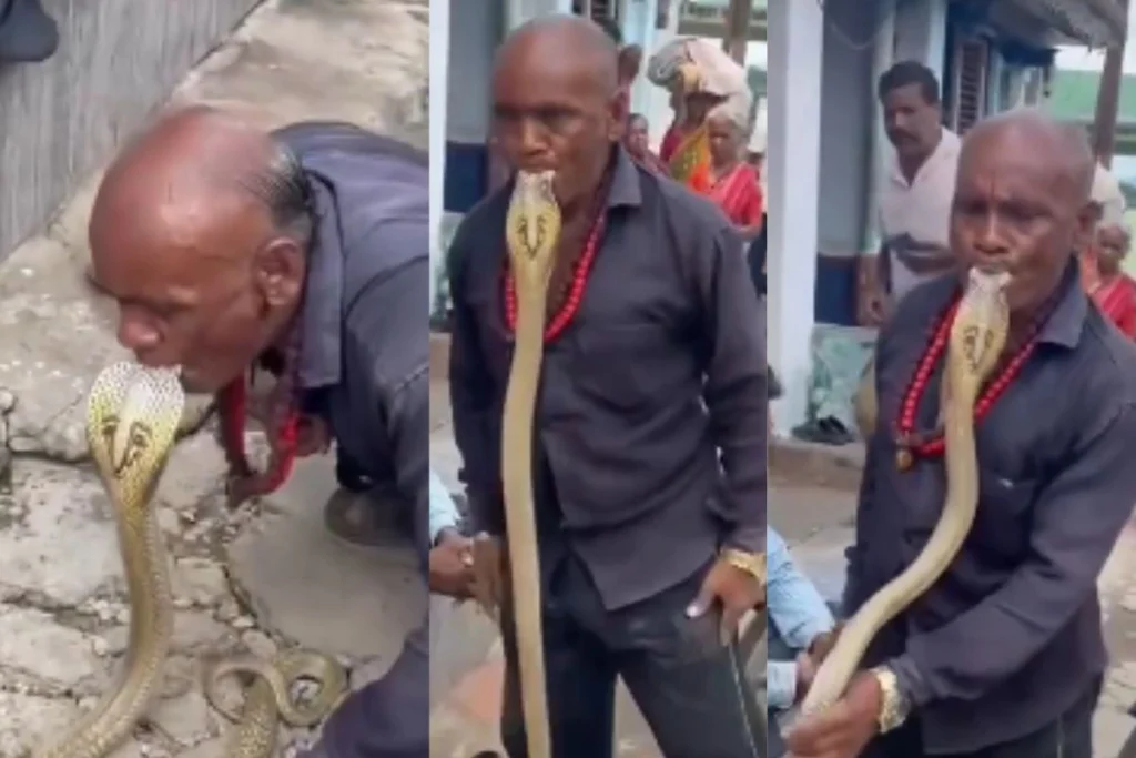 Viral Video: इंसान की सनक के आपने एक से बढ़कर एक वीडियो देखे होंगे, लेकिन यकीन मानिए ये सबसे हटकर है। क्योंकि इसमें एक आदमी भौकाल दिखीने के लिए जहरीले नाग को अपने मुंह में भर लेता है। हैरानी की बात ये है कि, नाग फड़फड़ाता रहता है और चाहकर भी कुछ नहीं कर पाता है। इस वीडियो को देखने के बाद कुछ लोग आदमी को यमराज का दोस्त बता रहे हैं तो वहीं, कुछ लोग इसे नागों का राजा बता रहे हैं। इस वीडियो ने यूजर्स को सोचने पर मजबूर कर दिया है।