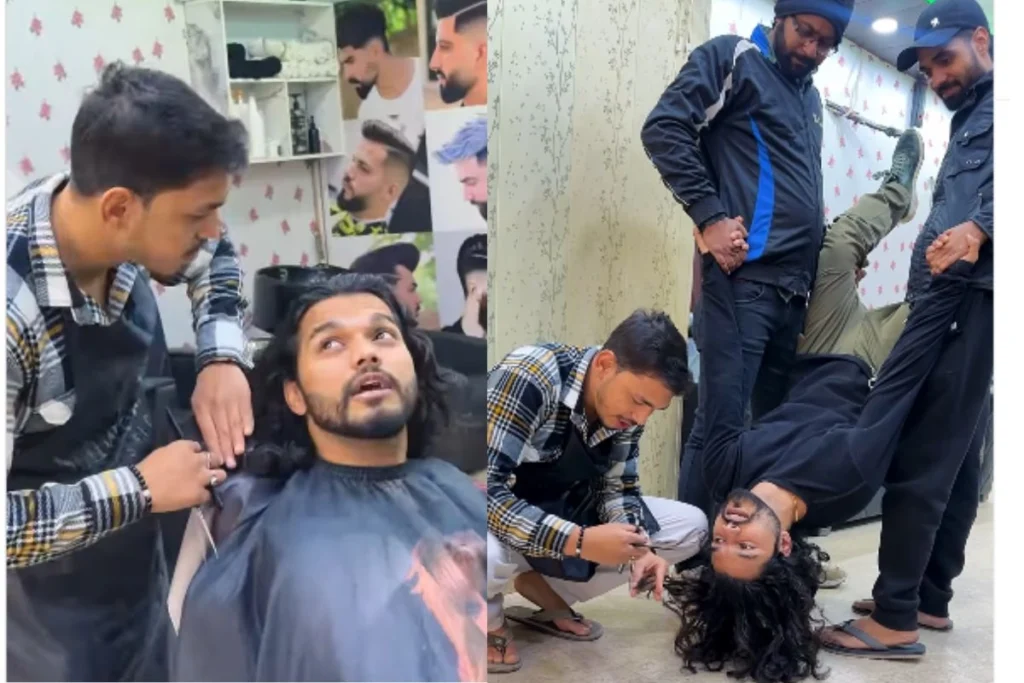 इस वायरल वीडियो में देखा जा सकता है कि, एक लड़का Saloon बाल कटवाने के लिए पहुंचा है। लेकिन वह नहीं चाहता कि, उसके ऊपर कटे हुए बाल गिरे और वो जाकर नहाए। इसलिए वो अपने ऊपर बाल ना गिरने की शर्त पर नाई को बाल काटने को कहता है। ये सुनते ही पहले तो नाई का दिमाग खराब होता है। इसके बाद वह लड़के को उल्टा करके उसके बाल काटने लग जाता है। उसके बाद उससे अपने तरीके के बारे में पूछता है, वो बोलता है बिल्कुल ठीक है। अब यही Viral Video लोगों को हंसा रहा है।