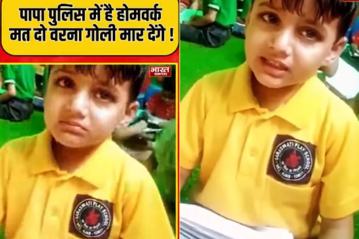 वीडियो में देखा जा सकता है कि, एक छोटा सा बच्चा अपनी टीचर को धमका रहा है। वो टीचर के होमवर्क देने से काफी नाराज है। यही वजह है कि, वो कह रहा है कि, पापा पुलिस में है होमवर्क मत दो वरना गोली मार देंगे ! बच्चा रोया हुआ मुंह बनाए हुए है और टीचर को प्यार भरी धमकी दे रहा है। ये मासूमियत यूजर्स को काफी लुभा रही है।