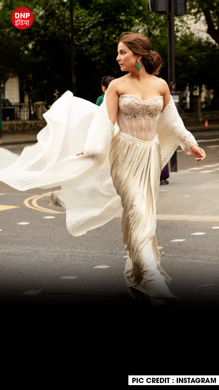 इन फोटोज में वे सफेद रंग की साड़ी में नजर आ रही है, जिसे उन्होंने गाउन की तरह कैरी किया है।