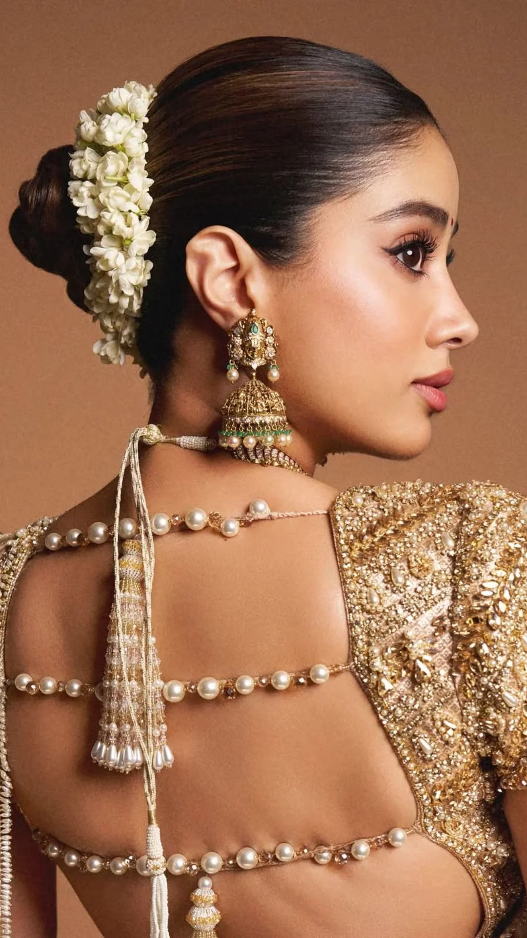 सिंपल ब्लाउज को यूनिक लुक दे सकते हैं अगर आप जाह्नवी कपूर की तरह पर्ल को आगे से स्टाइल करती है। यह लहंगे से लेकर साड़ी तक के लिए बेस्ट डिजाइन है।