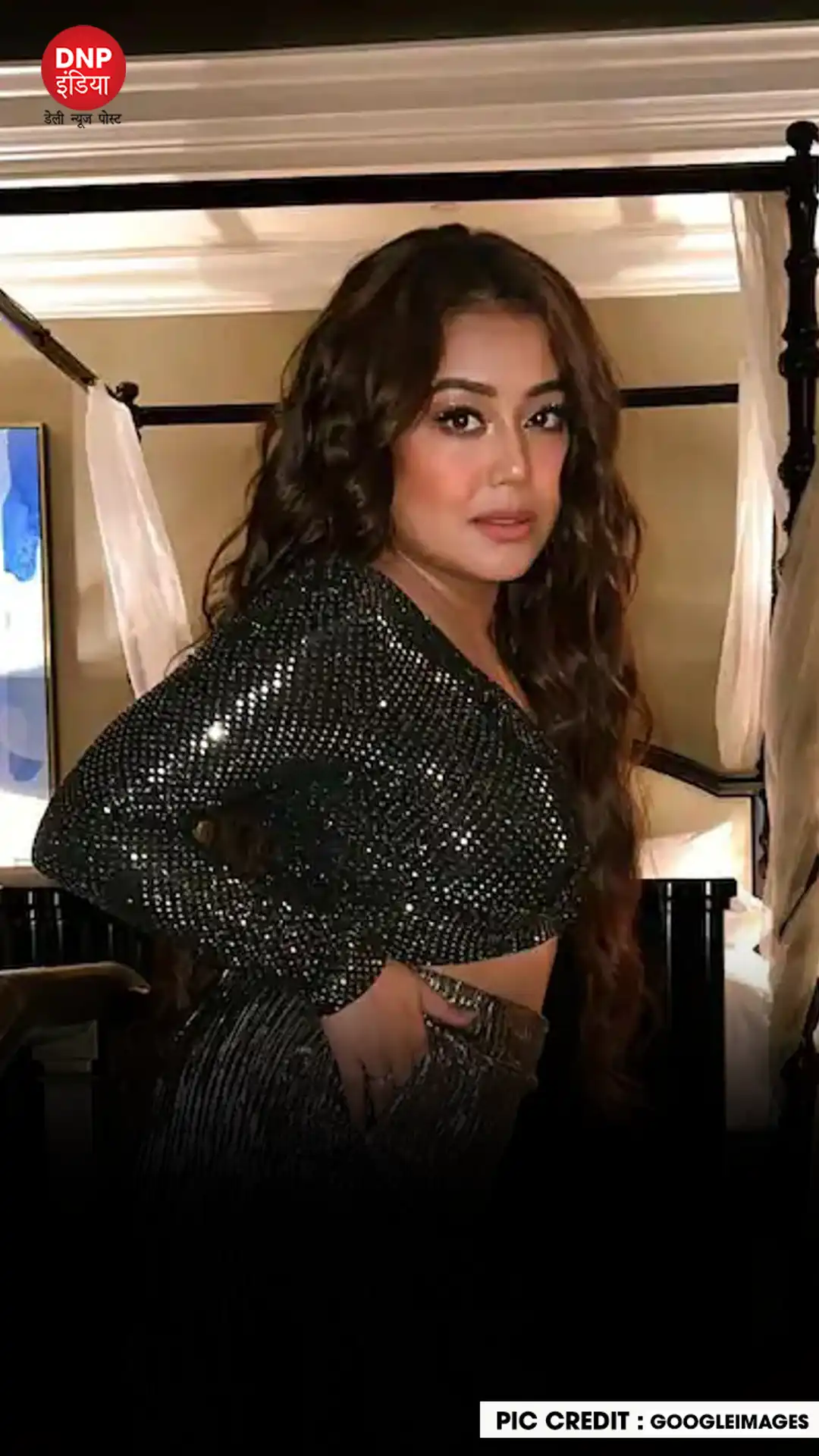 नेहा ने डीप वी नेकलाइन  ब्लैक सिक्विन क्रॉप टॉप और ब्लैक एंड सिल्वर मिक्स प्लाज़ो पहन रखा है।
