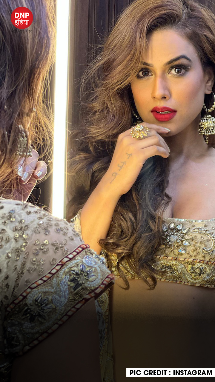निया को लेटेस्ट फोटोज में हैवी एम्ब्रॉयडरी वाला गोल्डन लहंगा पहने देखा जा रहा है।