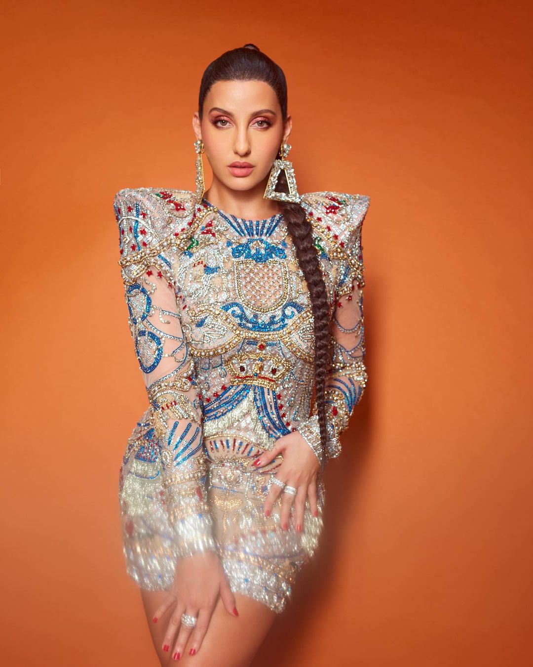नोरा फतेही एम्बेलिश्ड शॉर्ट ड्रेस के साथ जिस तरह चोटी को स्टाइल किया उसे देख फैंस की निगाहें थम गई।