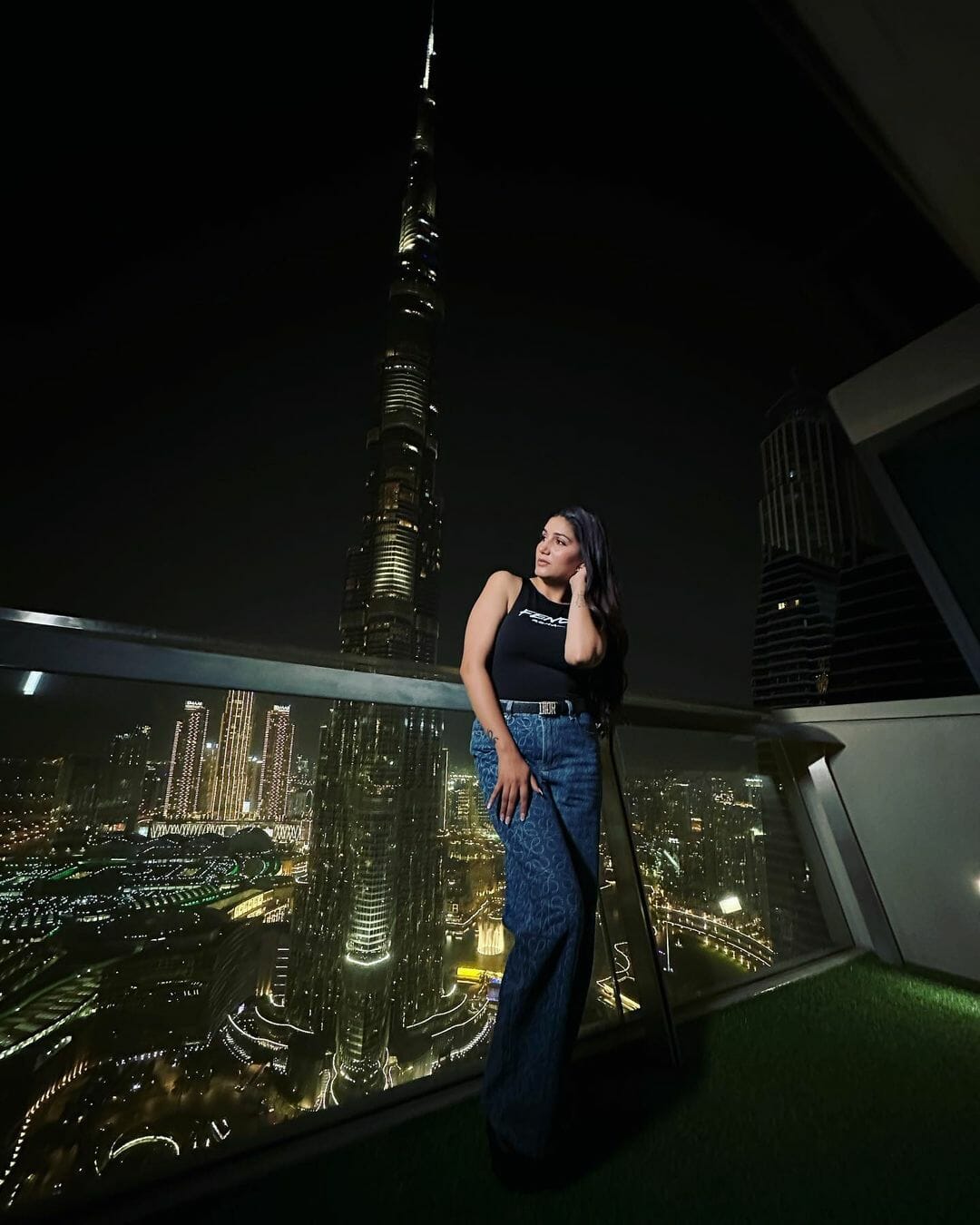बुर्ज खलीफा के सामने ओपन हेयर स्टाइल और सिंपल लुक में सपना काफी स्टाइलिश दिख रही हैं।